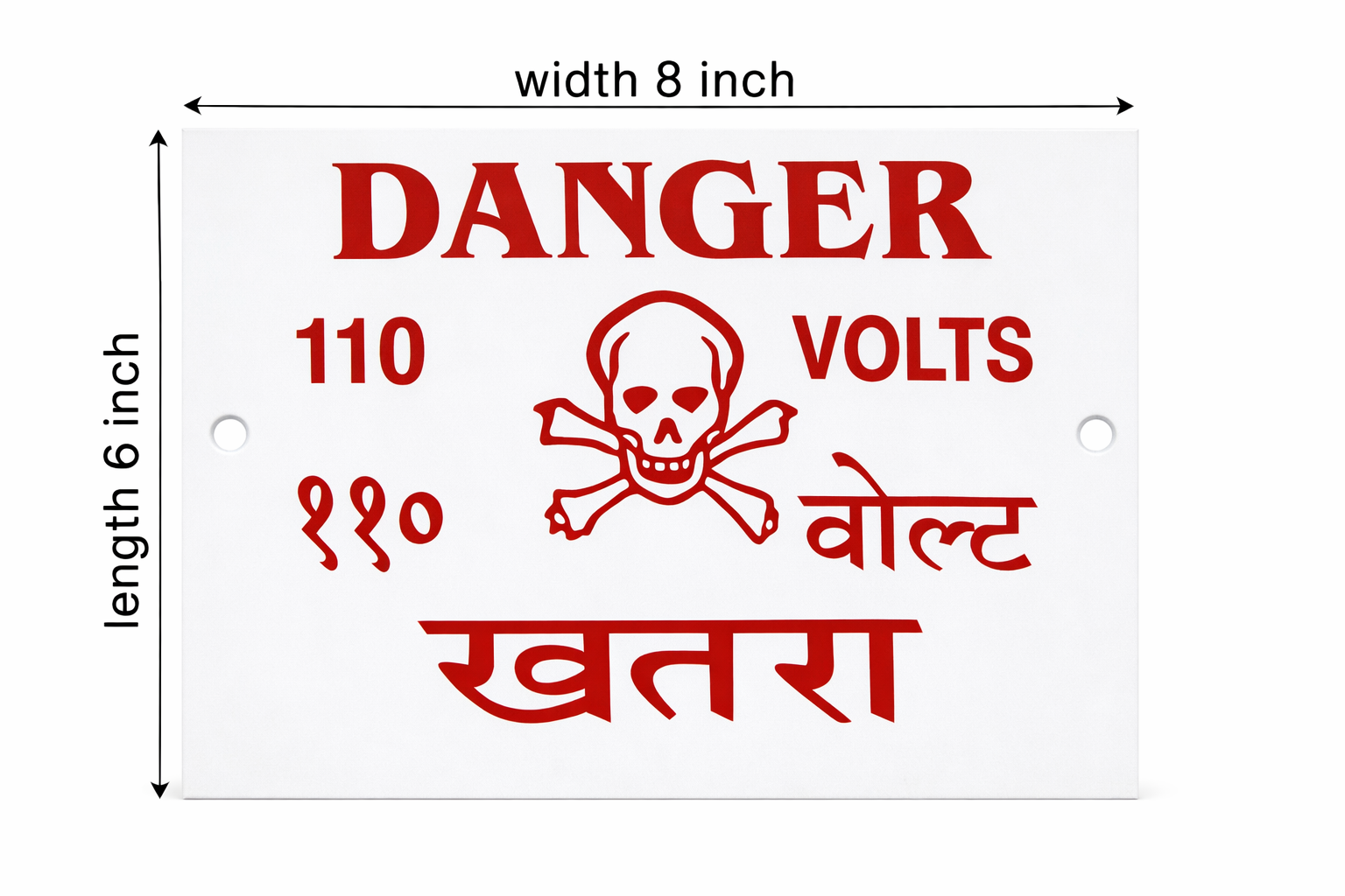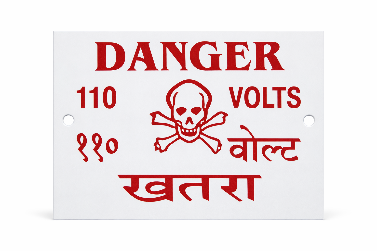 The purpose of the Danger Board 110 Volts electrical warning sign is to warn people about low to medium voltage electrical hazards in a clear and conspicuous manner. The English text “DANGER 110 VOLTS” is displayed in bold red on a white background with a skull symbol. For ease of comprehension, the voltage marking in Hindi is “११०,” and the warning in Hindi is “खतरा”.