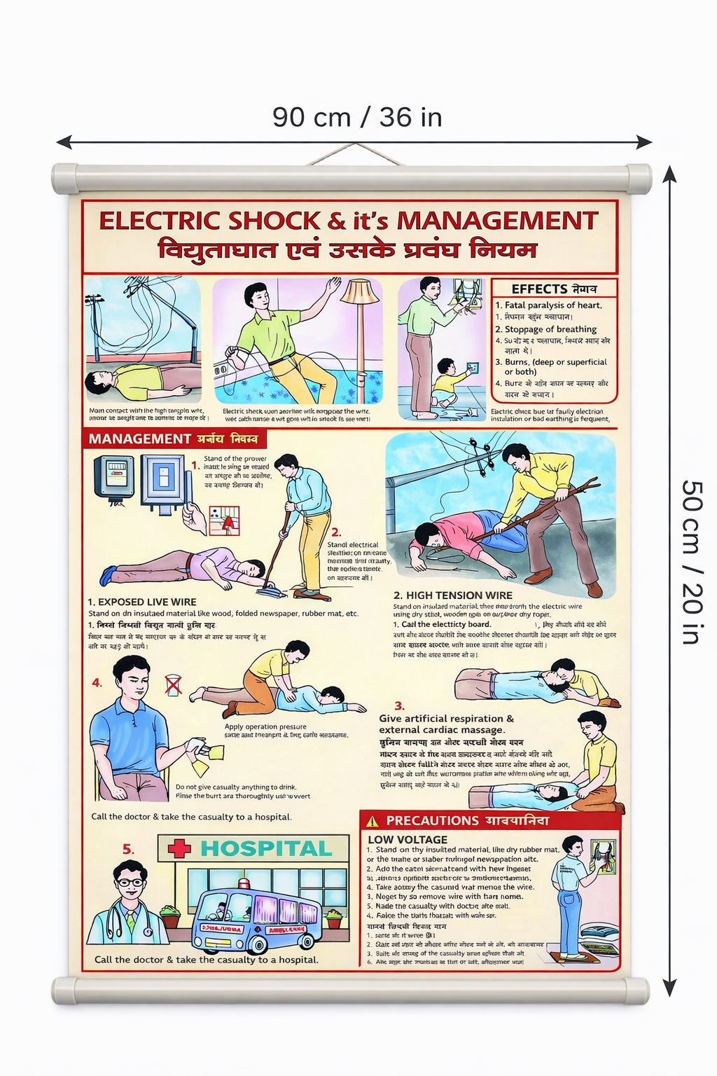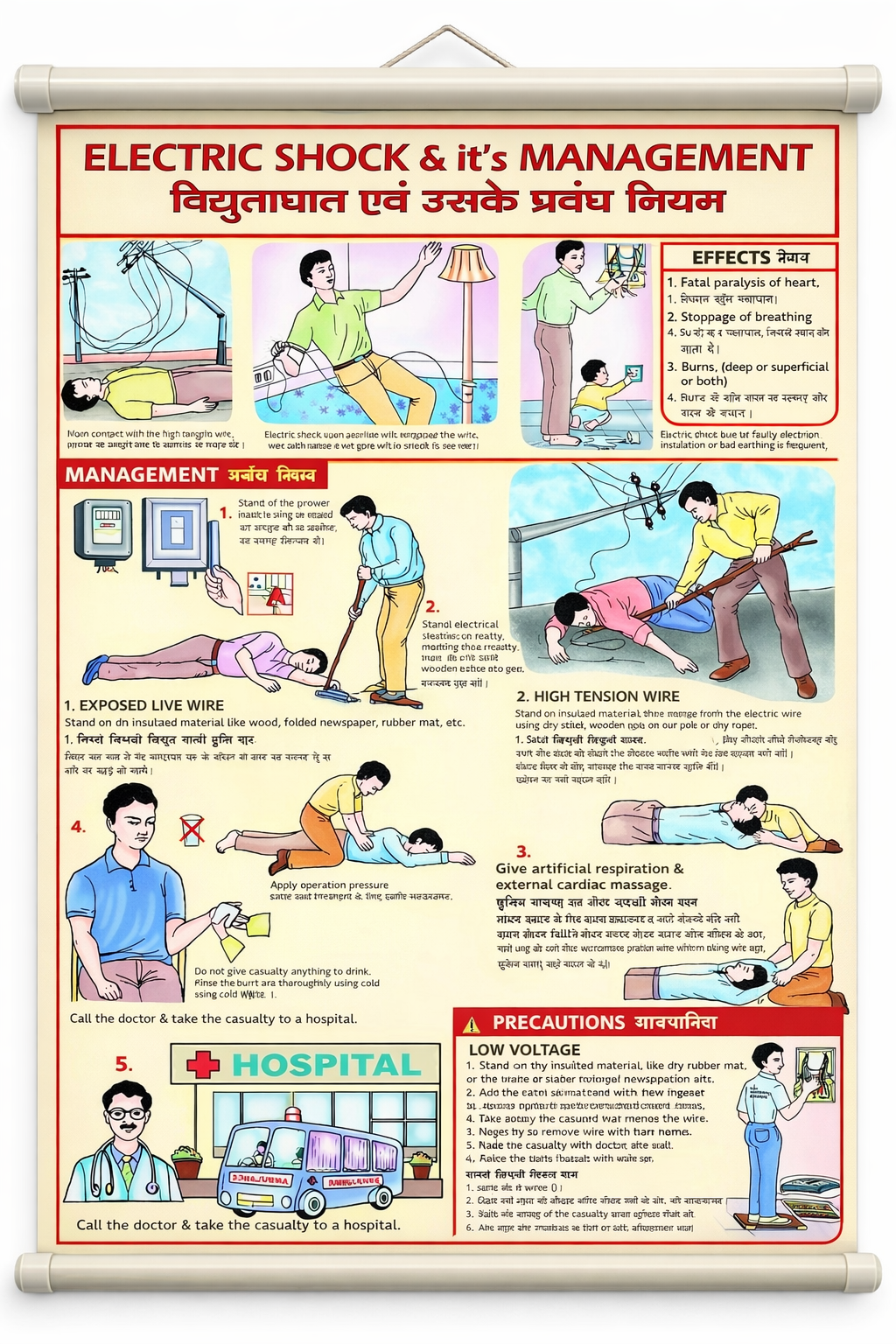 This educational safety poster titled “Electric Shock & Its Management” provides clear and illustrated guidance on how to prevent, handle, and give first aid during electric shock emergencies. The chart includes step-by-step instructions in Hindi with detailed images showing methods to disconnect power supply, manage victims safely, give CPR, manage burns, and follow precautions for both low-voltage and high-voltage electric shock incidents.