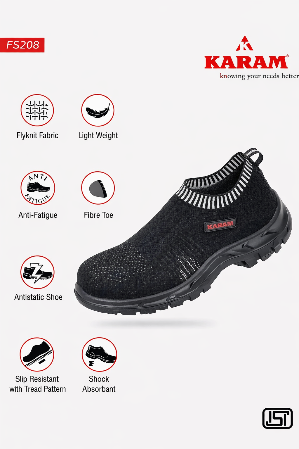 Karam FS208 Safety Shoes are modern lightweight industrial safety footwear designed for professionals working in demanding environments. Built with a breathable knitted upper and durable sole construction, this model provides comfort, flexibility, and reliable protection during long working hours.