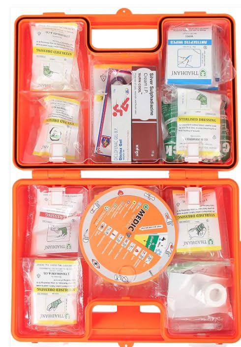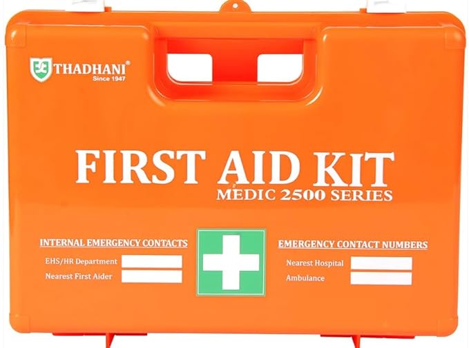 Thadhani MEDIC High Visibility First Aid Kit – 2500 Series is an extremely durable, ANSI Type III compliant first aid solution intended to be serviceable for as many as 25 people. Made from strong ABS material, it features a bright orange high-visibility case that assists in quickly identifying the kit in case of an emergency. The water-resistant, semi-transparent cover makes viewing and reaching supplies quickly and easily possible. Portable and wall-mountable, this first aid kit is suitable for the workplace, office, factory, school, and industrial use.
